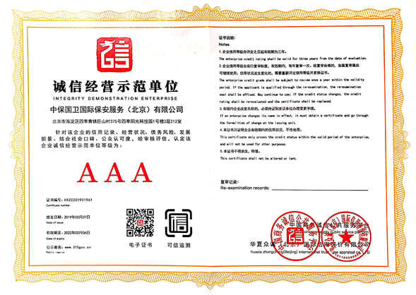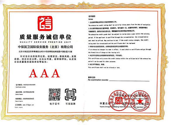 中保國衛(wèi)國際保安服務(wù)(北京)有限公司,屬中保國衛(wèi)集團(tuán)旗下子公司。能全方位的為大型客戶提供優(yōu)質(zhì)的安保、押運(yùn)服務(wù),是集人防和技防于一體的新型正規(guī)化綜合安保押運(yùn)服務(wù)企業(yè),提供人防、物防、技防、聯(lián)網(wǎng)報*、非武裝押運(yùn)等安防相關(guān)的一站式服務(wù)。